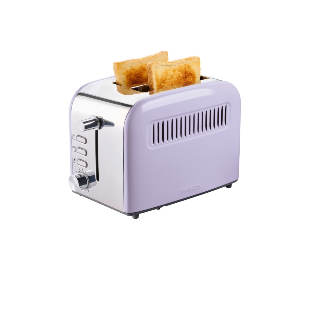 920W double-slot toaster with 7 browning levels, defrost, reheat, and cancel functions. Features crumb tray, cord storage, and purple finish. 230V, wide slots.